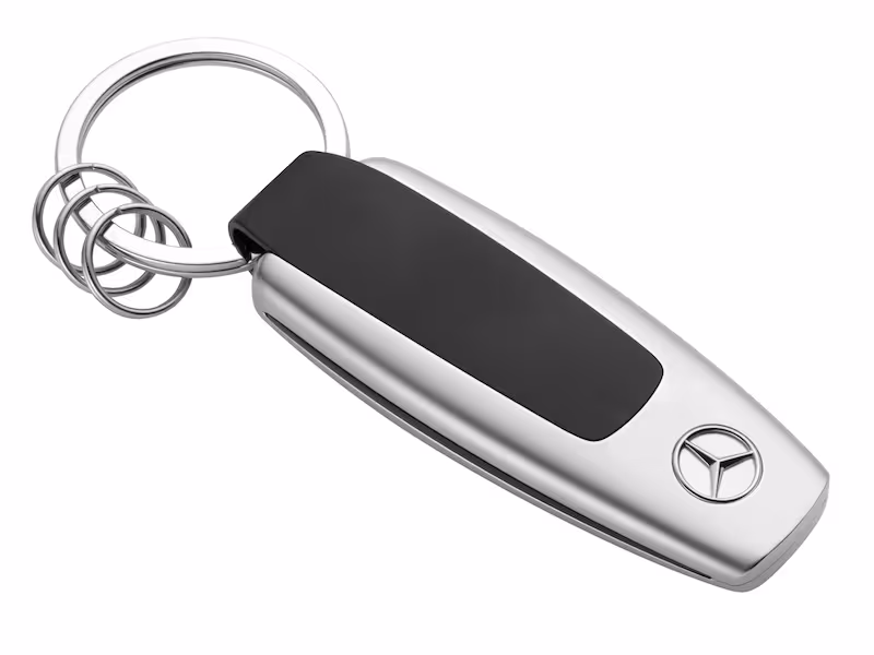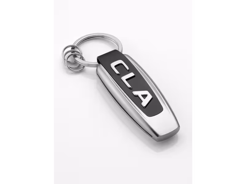 Portachiavi con scritta CLA. Color argento/nero. Acciaio legato. Anello portachiavi piatto con tre mini-anelli aggiuntivi per sostituire/estrarre rapidamente singole chiavi. Scritta originale del cofano bagagliaio sul lato anteriore, Stella 3D sul retro. Designed in Germany. Lunghezza ca. 9 cm.